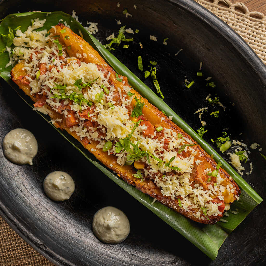 Plátano maduro relleno de quesito, posta desmechada, trocitos de chorizo y maicitos, coronado con queso papialpa rallado,