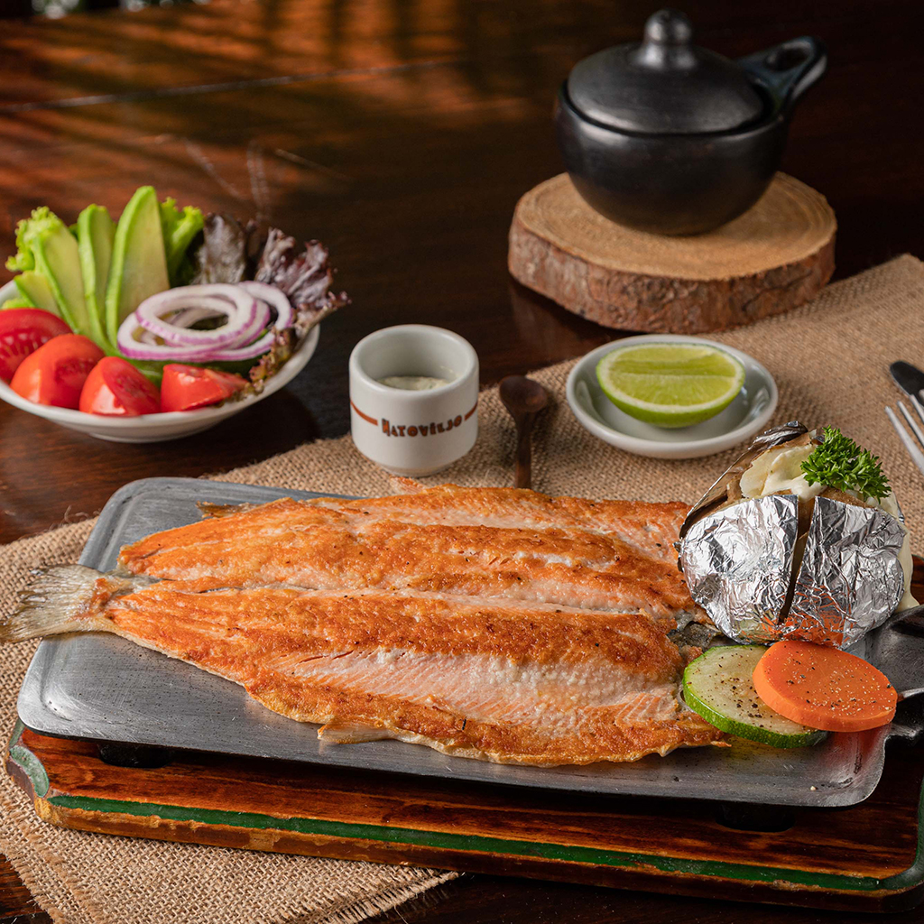 Trucha a la plancha con papa asada y acompañadas de ensalada, término único.