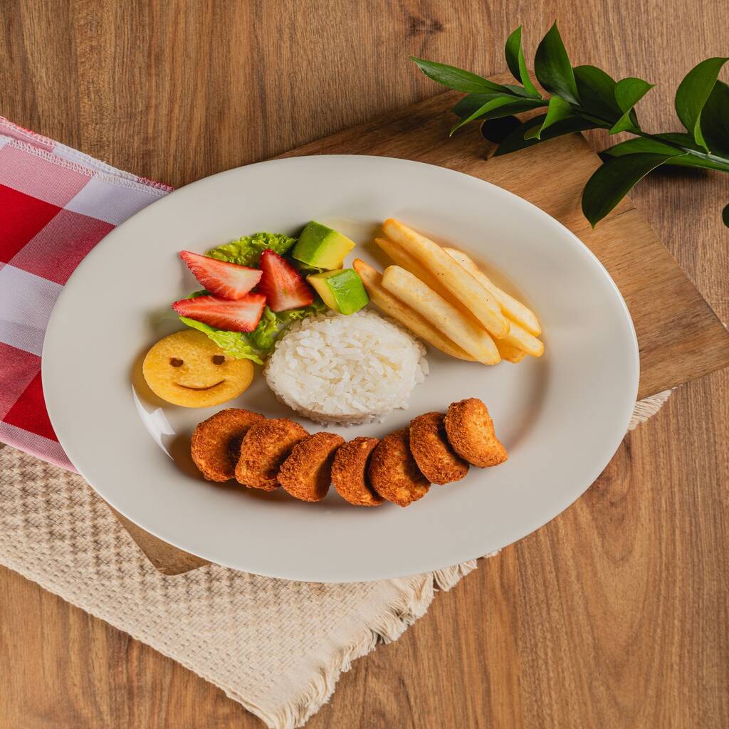 Nuggets de pollo con papas a la francesa, arroz y fresitas, carita de papa según disponibilidad.