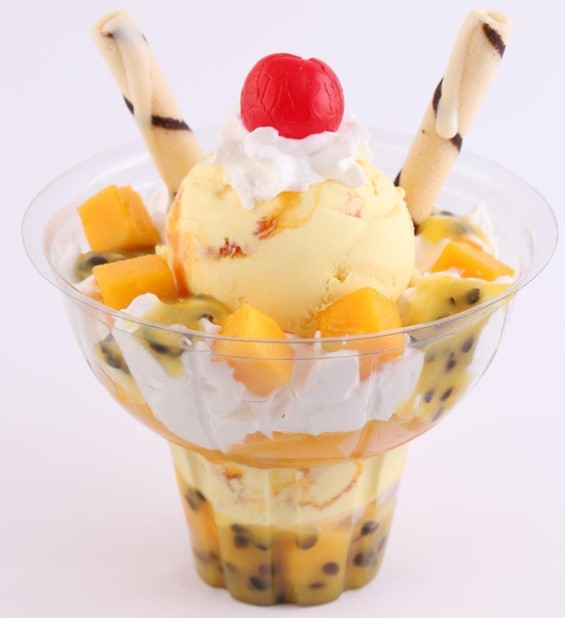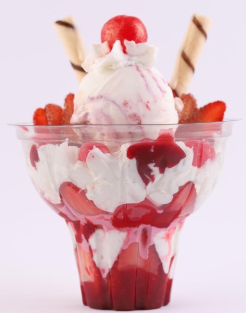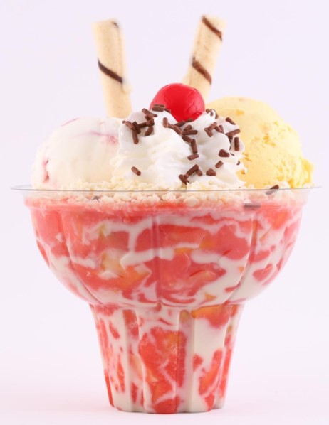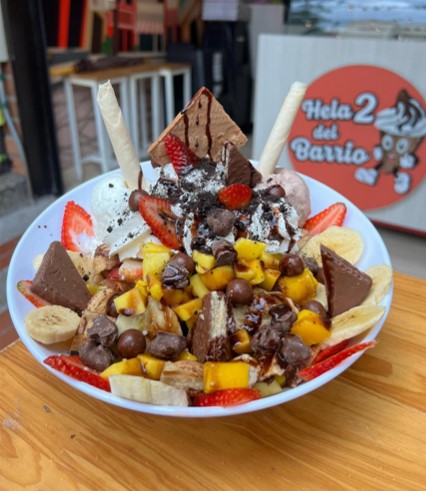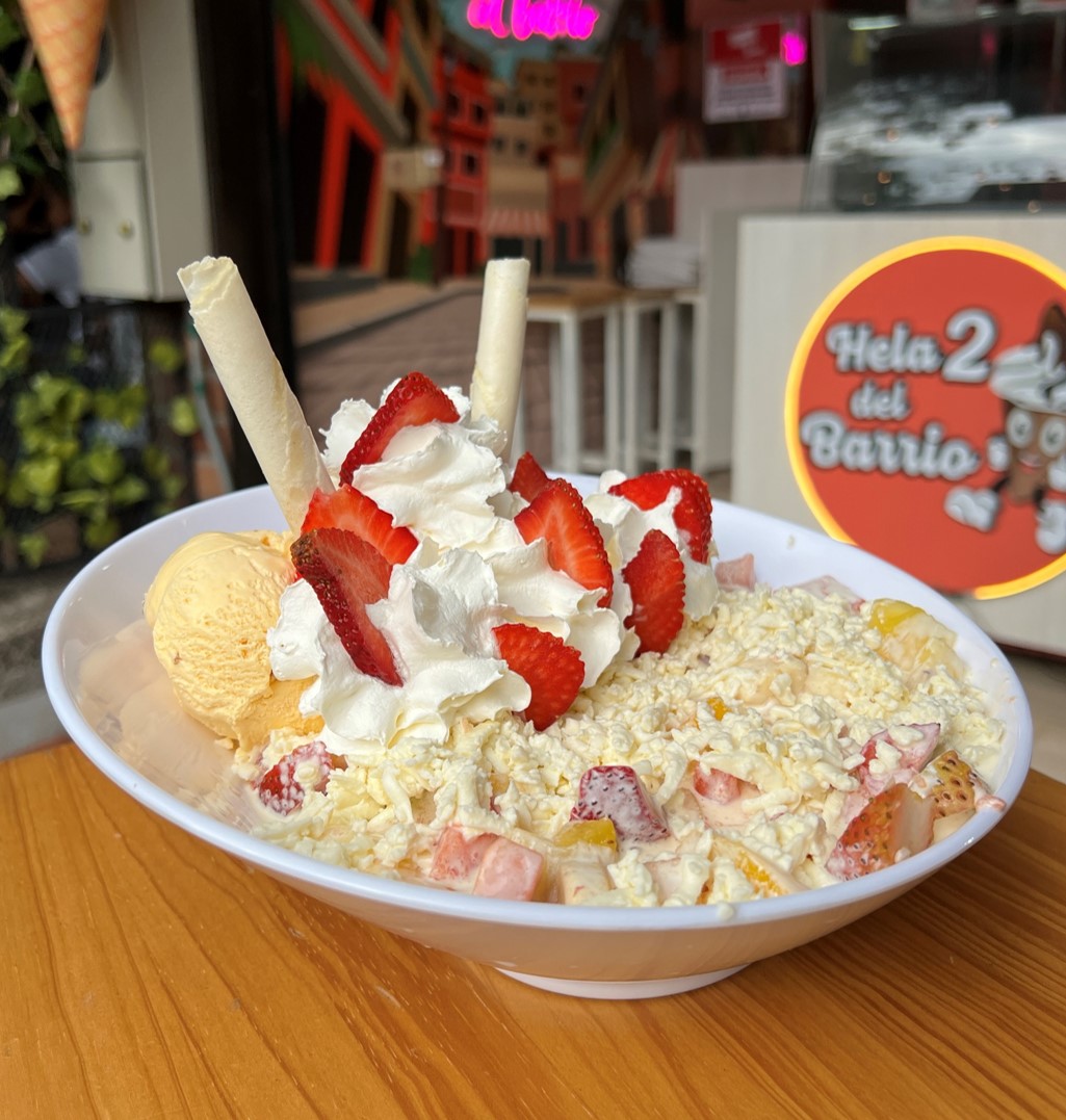 Exquisita mezcla de frutas, acompañada con 2 sabores de helado, queso, chantilly, trozos de fresa, barquillo y leche condensada.