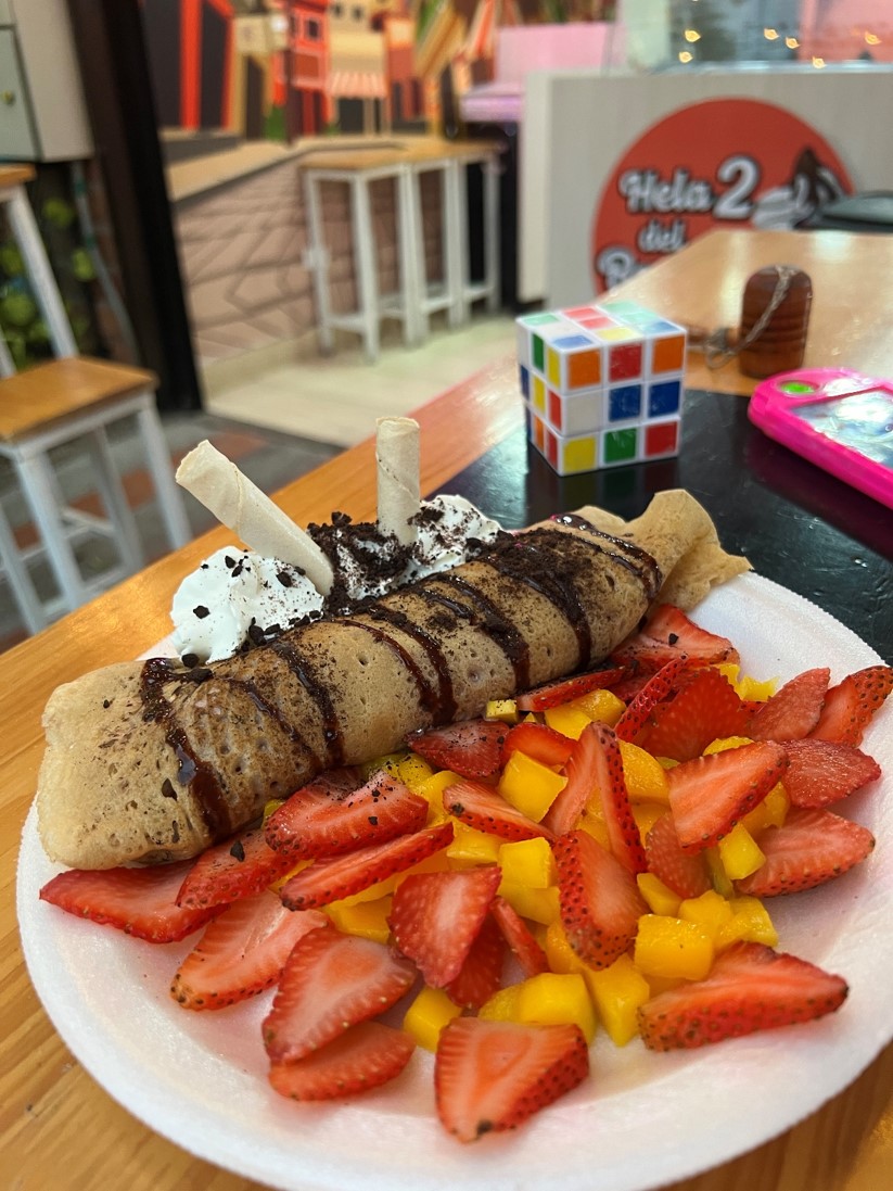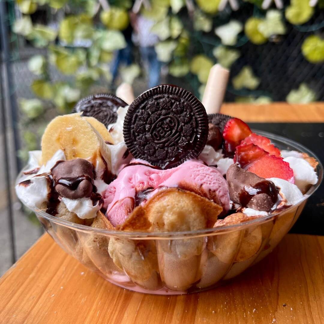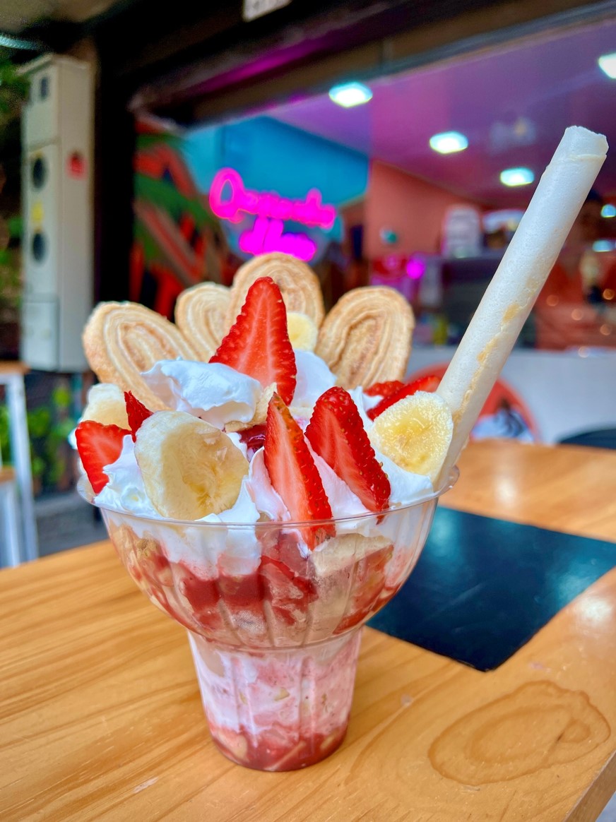 Deliciosa tortilla caliente que envuelve en su interior tu sabor de helado preferido, bañado en la salsa que elijas, acompañado de 3 frutas que puedes escoger (mango, piña, banano, fresa), chantilly, tritura de oreo y barquillo.