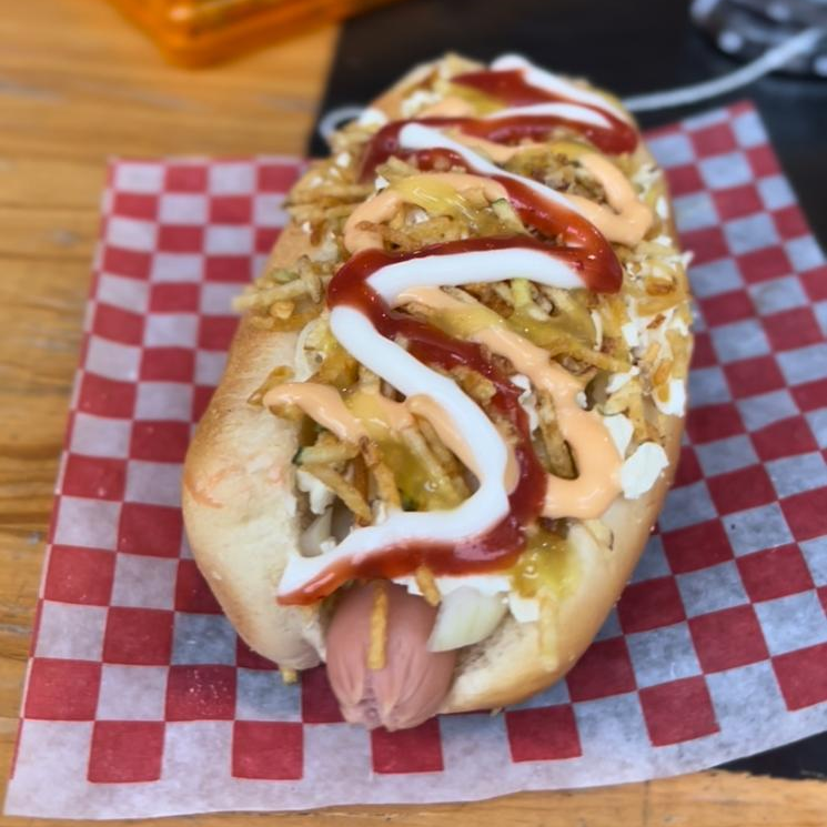 Delicioso perrito con salchicha Zenú, cebolla, tomate, queso, ripio de papa y salsas a elección.