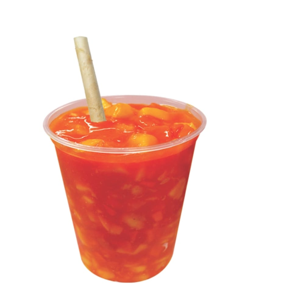 Exquisita mezcla de frutas, acompañado de leche condensada y barquillo.