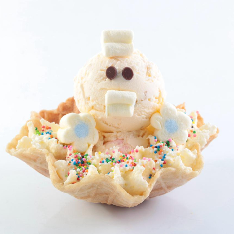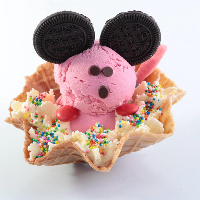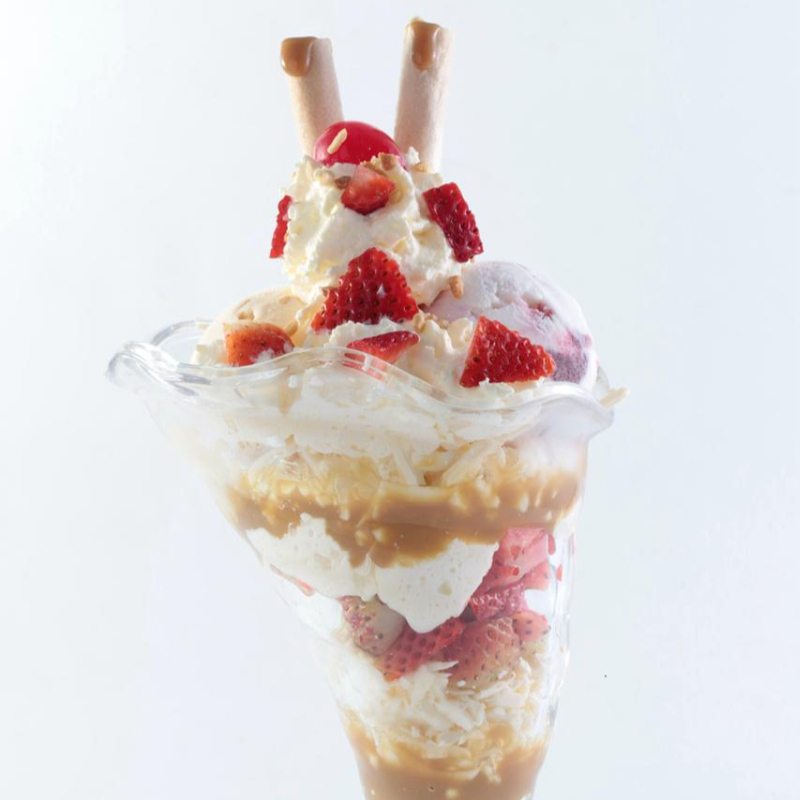 Malteada del sabor de helado elegido, grajeas de colores, cerezas, barquillo y chantilly.