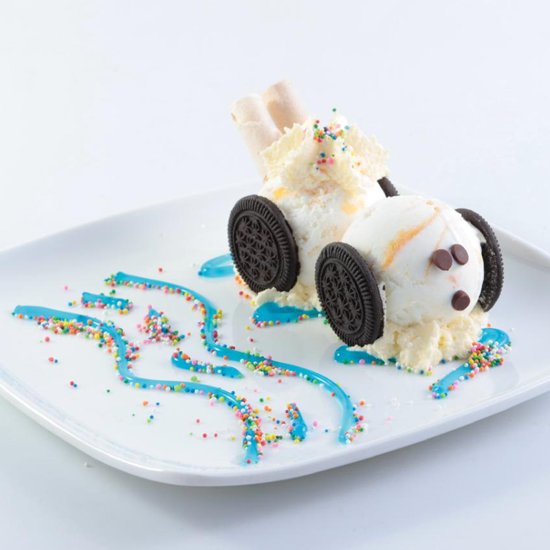 Dos sabores de helado acompañado de galleta oreo, gomas gusanos, grajeas de colores y chantilly.