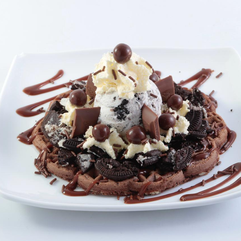 Waffle acompañado de salsa de chocolate, un sabor de helado, trozos de galleta oreo, chokis, chocolatina jet y chantilly
