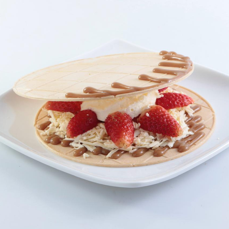 Oblea acompañada de salsa de arequipe, queso, fresa y chantilly.
