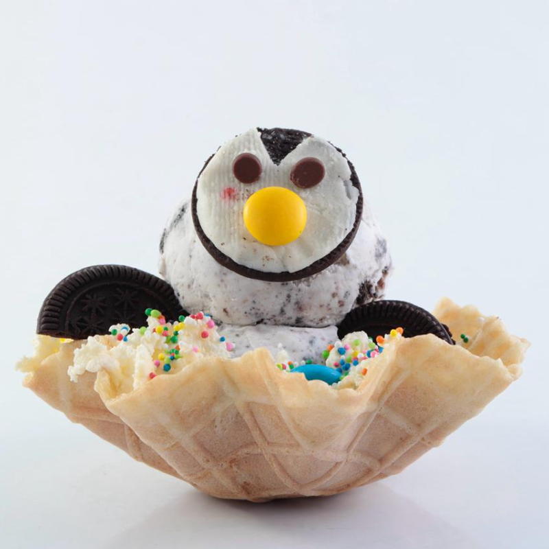 Dos sabores de helado acompañados de galleta oreo, chips de chocolate, grajeas de colores, barquillos y chantilly.