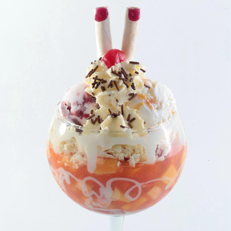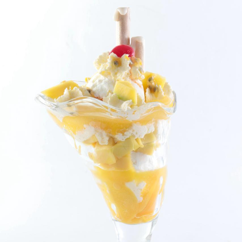 Dos sabores de helado, acompañados de durazno, mango, pulpa de maracuyá, leche condensada, cereza, barquillos y chantilly.