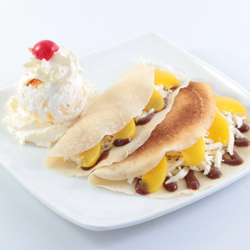 Crepes acompañado de salsa de chocolate, un sabor de helado, queso, trozos de durazno, cereza y chantilly