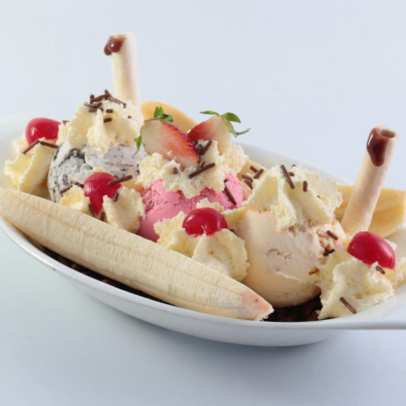 Tres sabores de helado acompañados de banano, salsa a elección, barquillos, cereza y chantilly.
