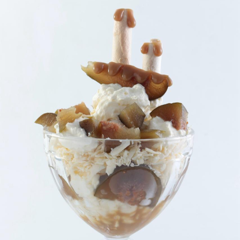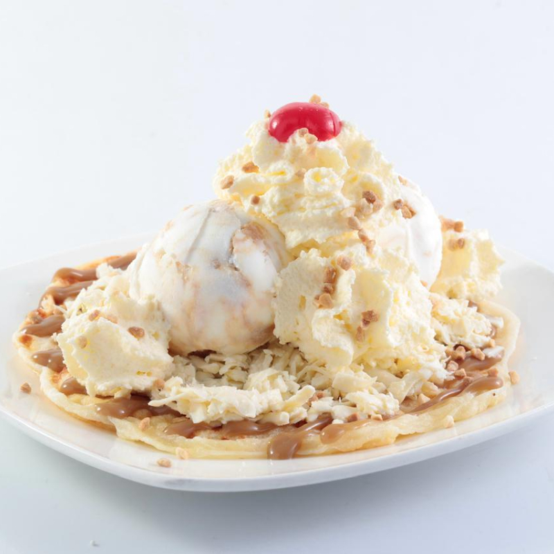 Un sabor de helado, acompañado de salsa de arequipe, trozos de brevas en almibar, queso, barquillos y chantilly.