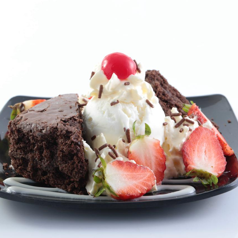 Brownie acompañado de un sabor de helado, fresas, salsa a elección, cereza y chantilly.