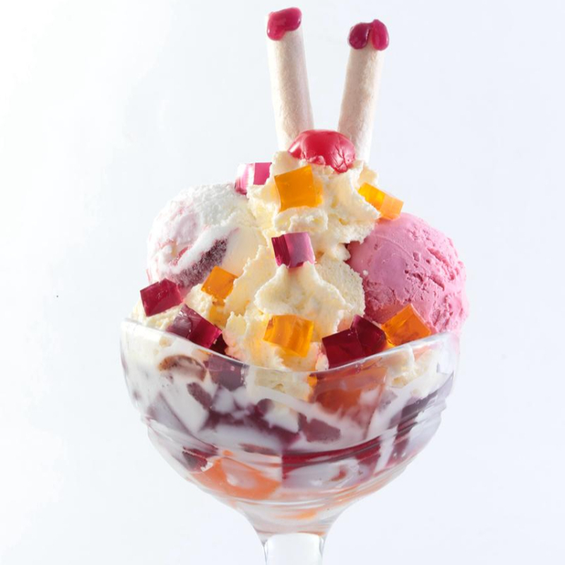 Dos sabores de helado, acompañados de trozos de gelatina, leche condensada, barquillos y chantilly.