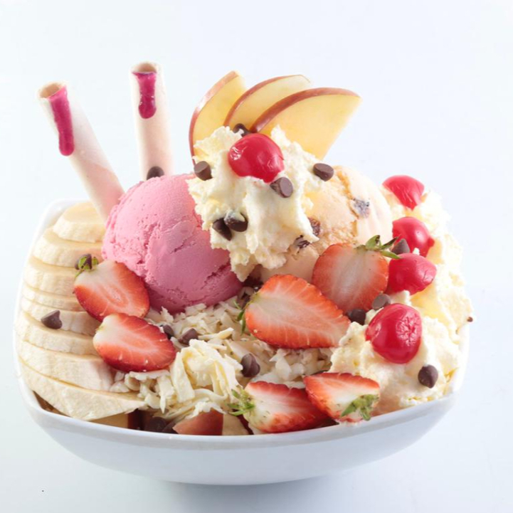 Mezcla de Salpicón, acompañado de dos sabores de helado, queso, leche condensada, lluvia de chocolate, cereza, barquillos y chantilly.