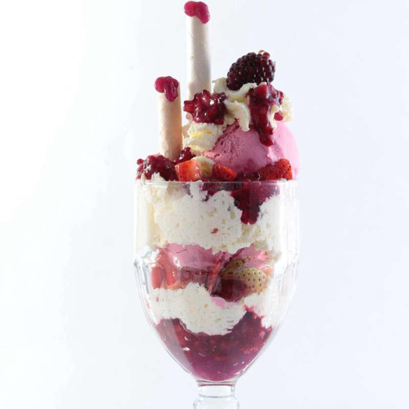 Dos sabores de helado, acompañados de trozos de mora, fresa, salsa de mora, barquillos y chantilly.