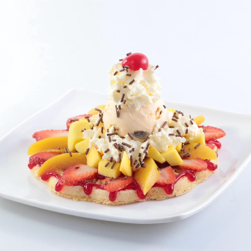 Waffle acompañado de salsa a elección, trozos de durazno, fresa, un sabor de helado, lluvia de chocolate, cereza y chantilly.