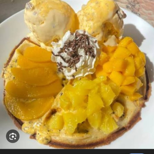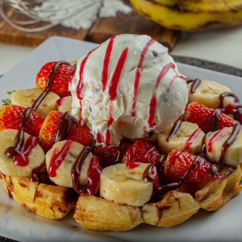 Dos sabores de helado, esponjoso waffle bañado en salsa de frutos amarillos acompañado de la mejor selección de durazno, mango y piña, salsa y chantilly