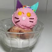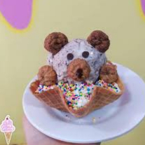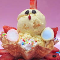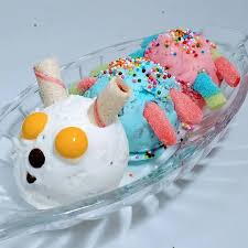tres sabores de helado, chantilly, lluvia de colores, gomitas, salsa