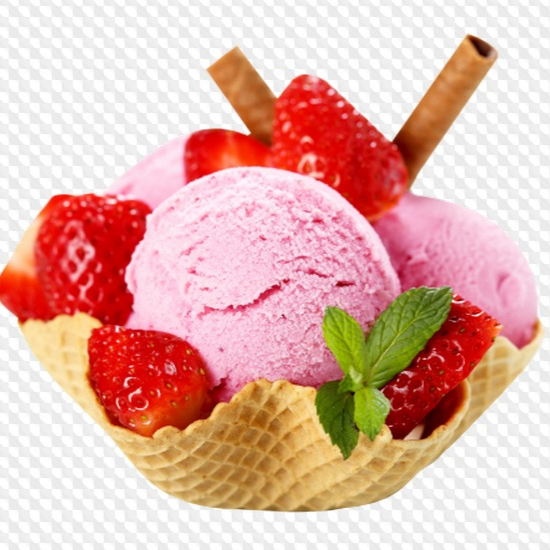 dos sabores de helado ,biscochuelo de vanilla bañado en tres leches, fresa, barquillo, salsa y chantilly
