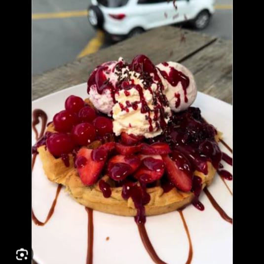Dos sabores de helado, esponjoso waffle bañado en salsa de frutos rojos acompañado de la mejor selección de cereza, fresas, mora, salsa y chantilly