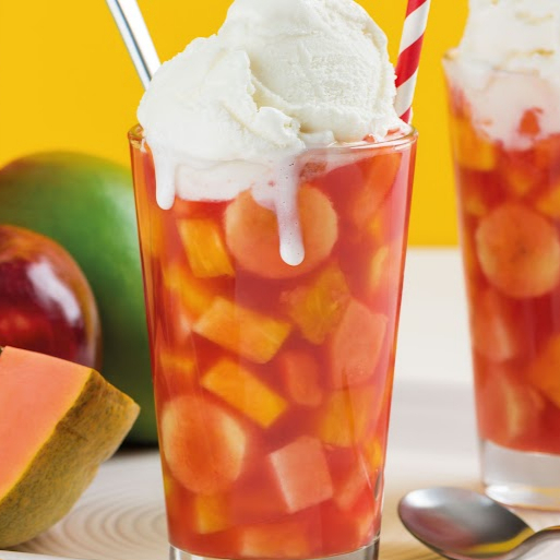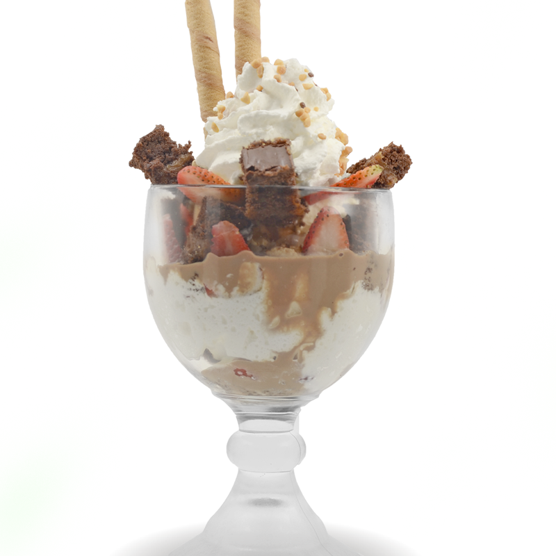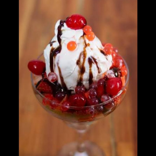 Dos sabores de helado, deliciosa mezcla de frutas, leche condensada, queso, lluvia de chocolate, barquillo, cereza y chantilly