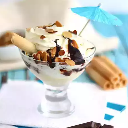 dos sabores de helado, trocitos de brownie , barquillo, salsa y chantilly