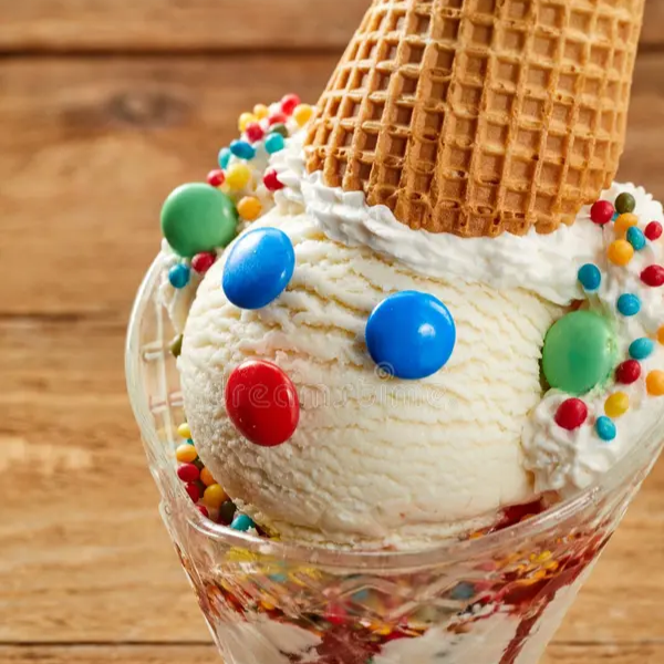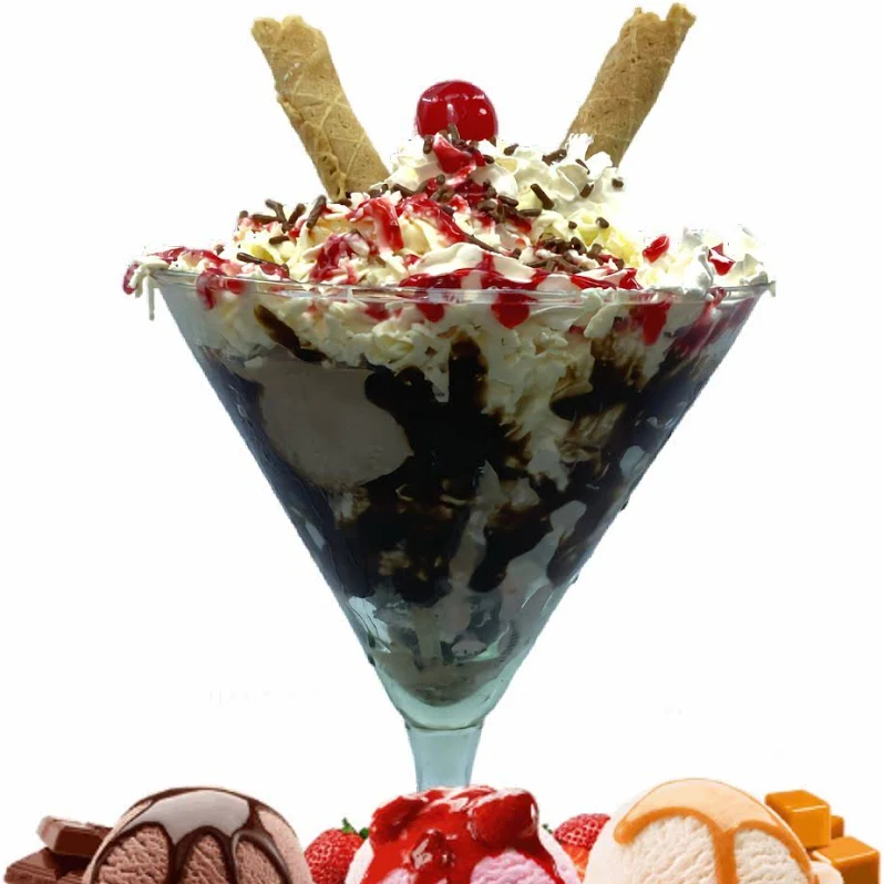 tres sabores de helado, cereza, banana, fresa, grageas de colores, salsa , barquillo y chantilly