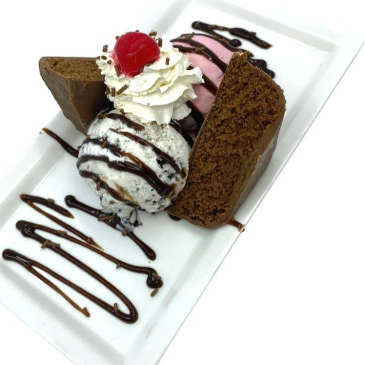 dos sabores de helado, delicioso brownie, salsa de chocolate , fresas , cereza , lluvia de chocolate, salsa y chantilly