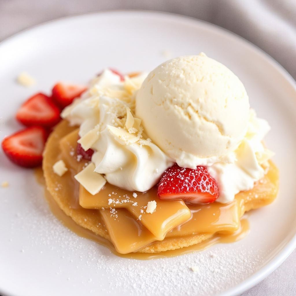 arequipe, chantilly, queso, fresas, y una bola de helado