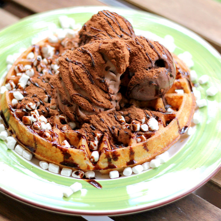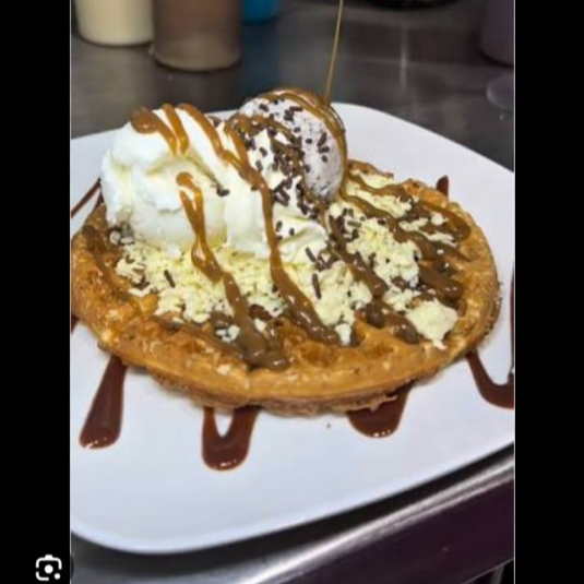 Dos sabores de helado, esponjoso waffle bañado en arequipe, lluvia de chocolate y chantilly