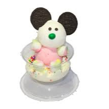 helado de fresa , leche, borde glaseado con crema de avellanas y grageas de colores , masmelos, sparkies,gomitas de gusanitos, salsa y chantilly