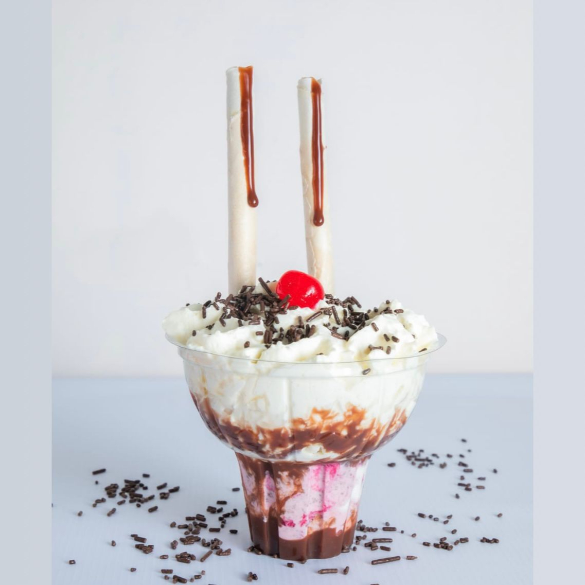 Dos sabores de helado, mezcla de salpicón, crema de leche, chantilly, salsa a elección, barquillo.