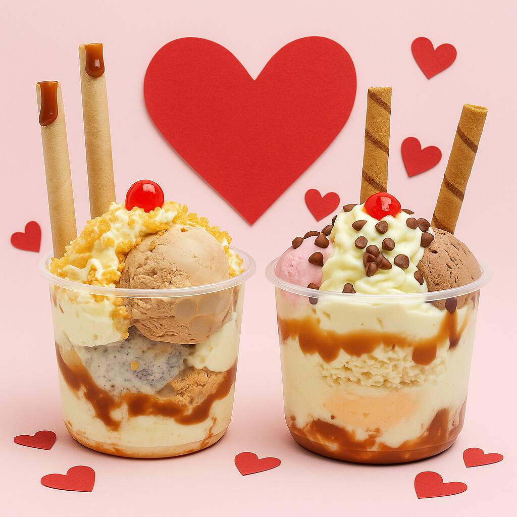 Copa con dos sabores de helado, full queso, crem de leche, chantilly. toping, crereza y dos barquillos, con salsa a eleccion