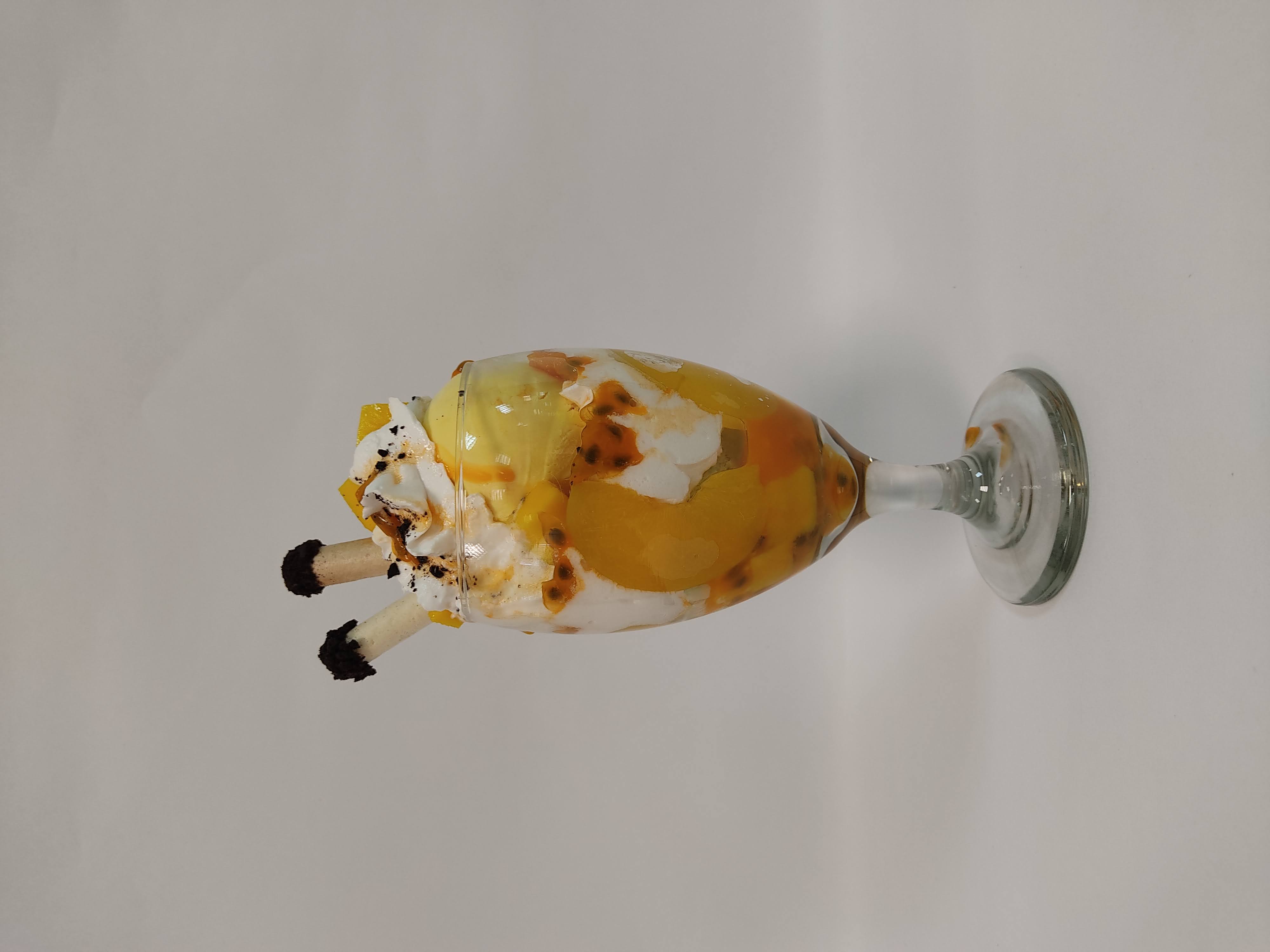 2 sabores de helado, acompañados de durazno, maracuyá y mango, crema chantilly,barquillo,oreo triturado y salsa