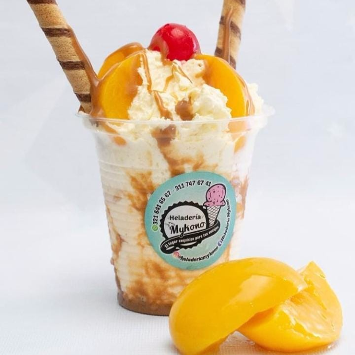 Banano, 3 porciones de helado,queso, crema chantilly, cereza, barquillo y salsa y adición de fresa o durazno.