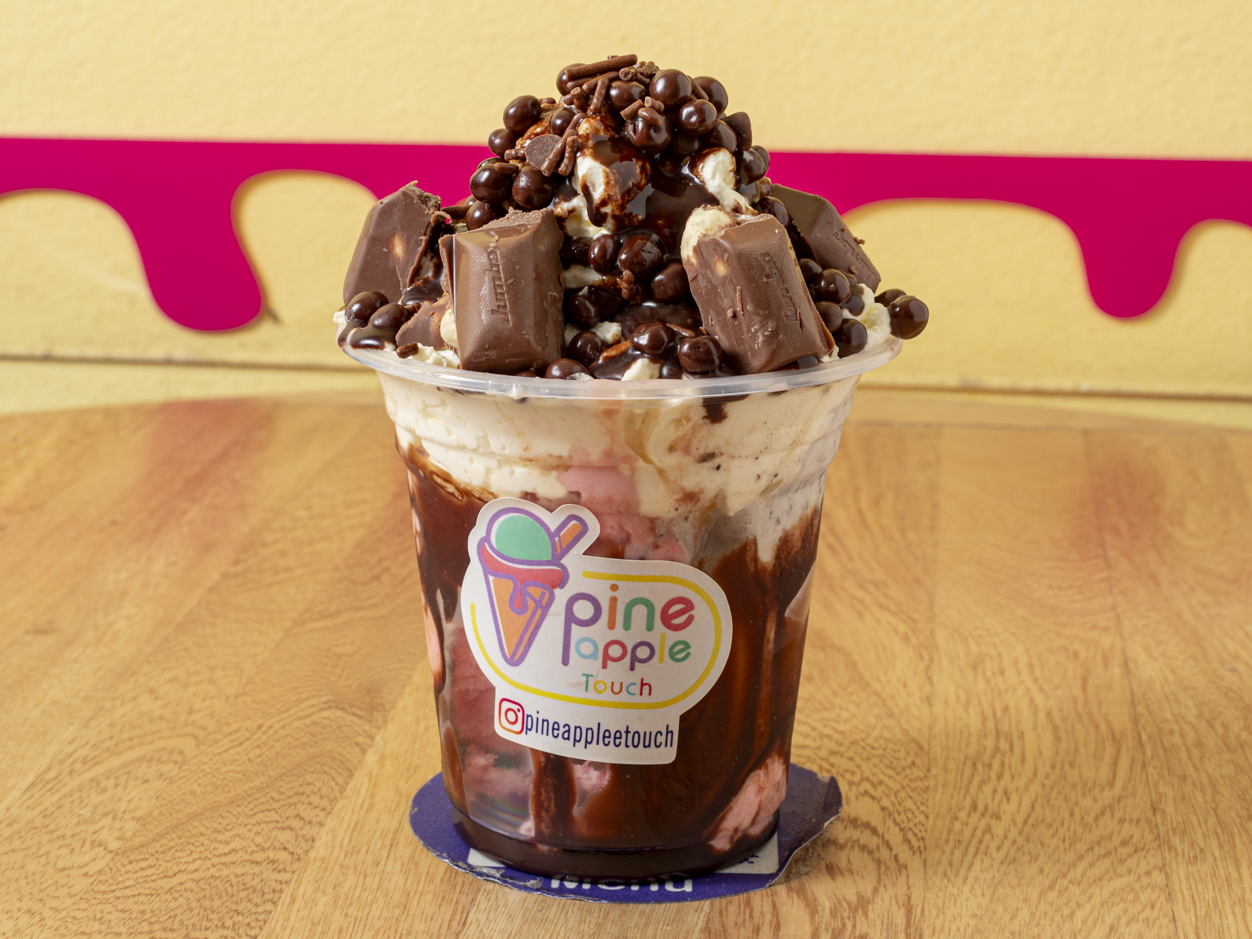 2 Bolas de helado popsy, chantilly, salsa de chocolate, chocolatina jumbo, barquillo de chocolate y lluvia de chocolate.