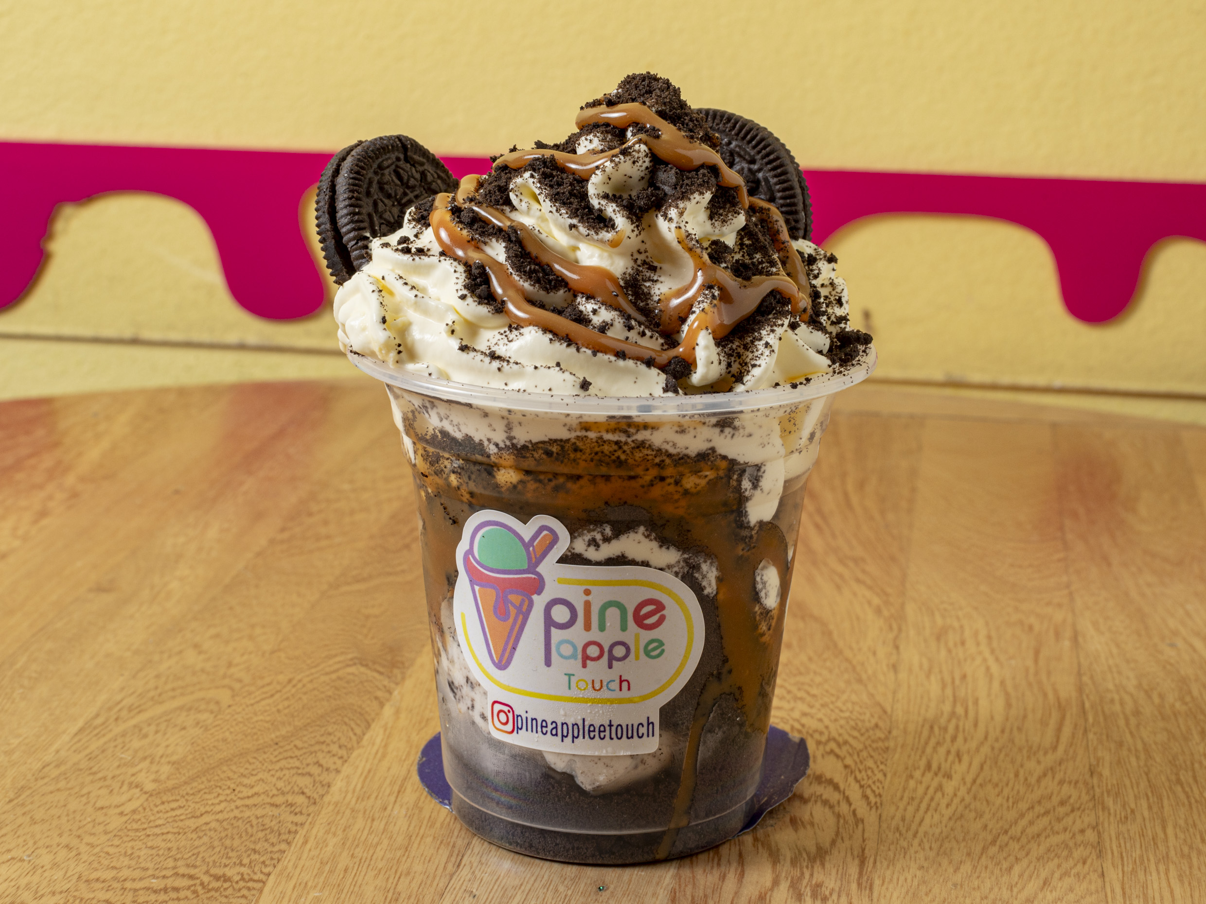 2 Bolas de helado popsy, chantilly, arequipe, galletas oreo y oreo triturado.