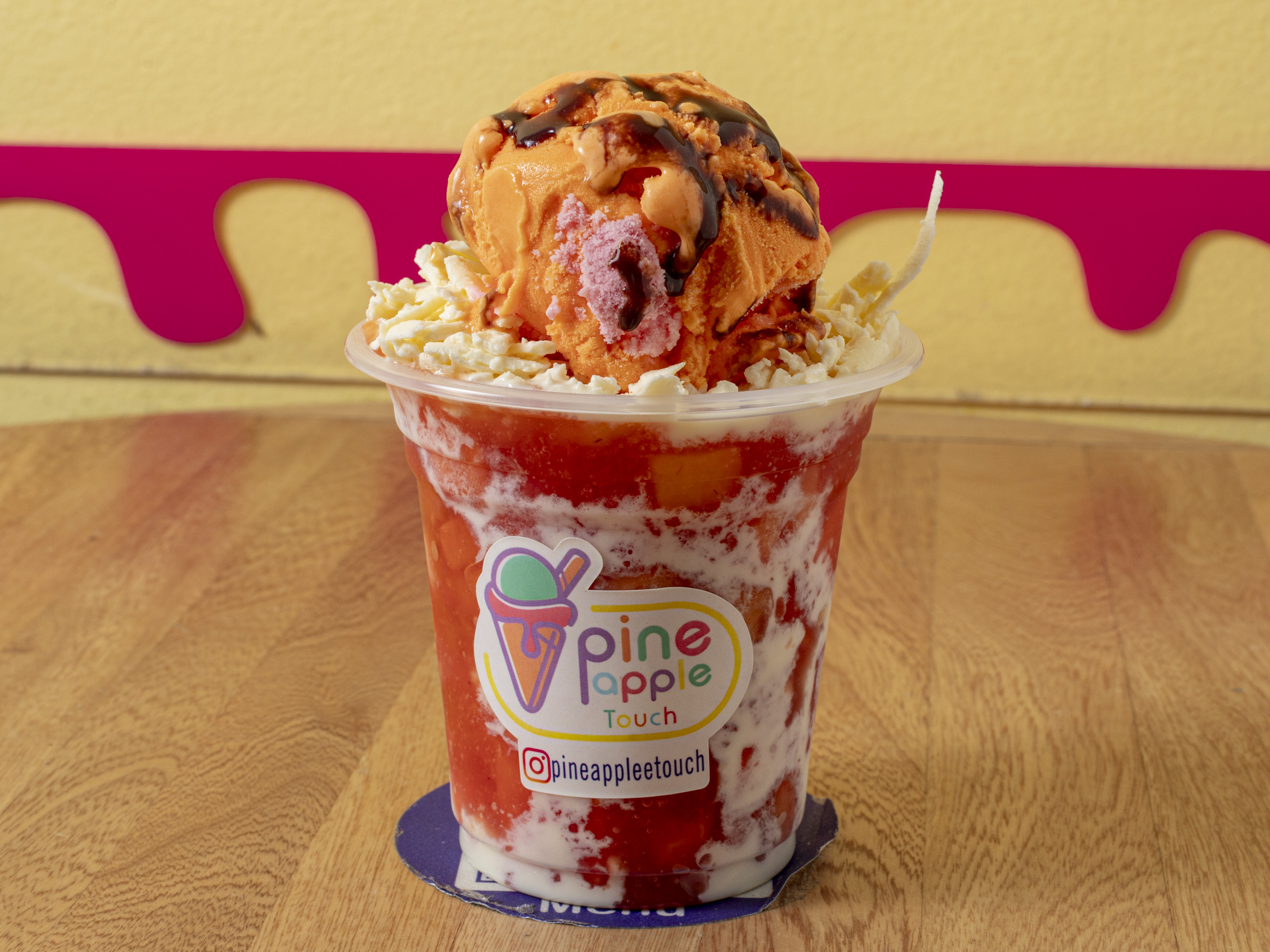 Deliciosa crema de la casa, piña, fresas, manzana, durazno, papaya, queso y helado popsy