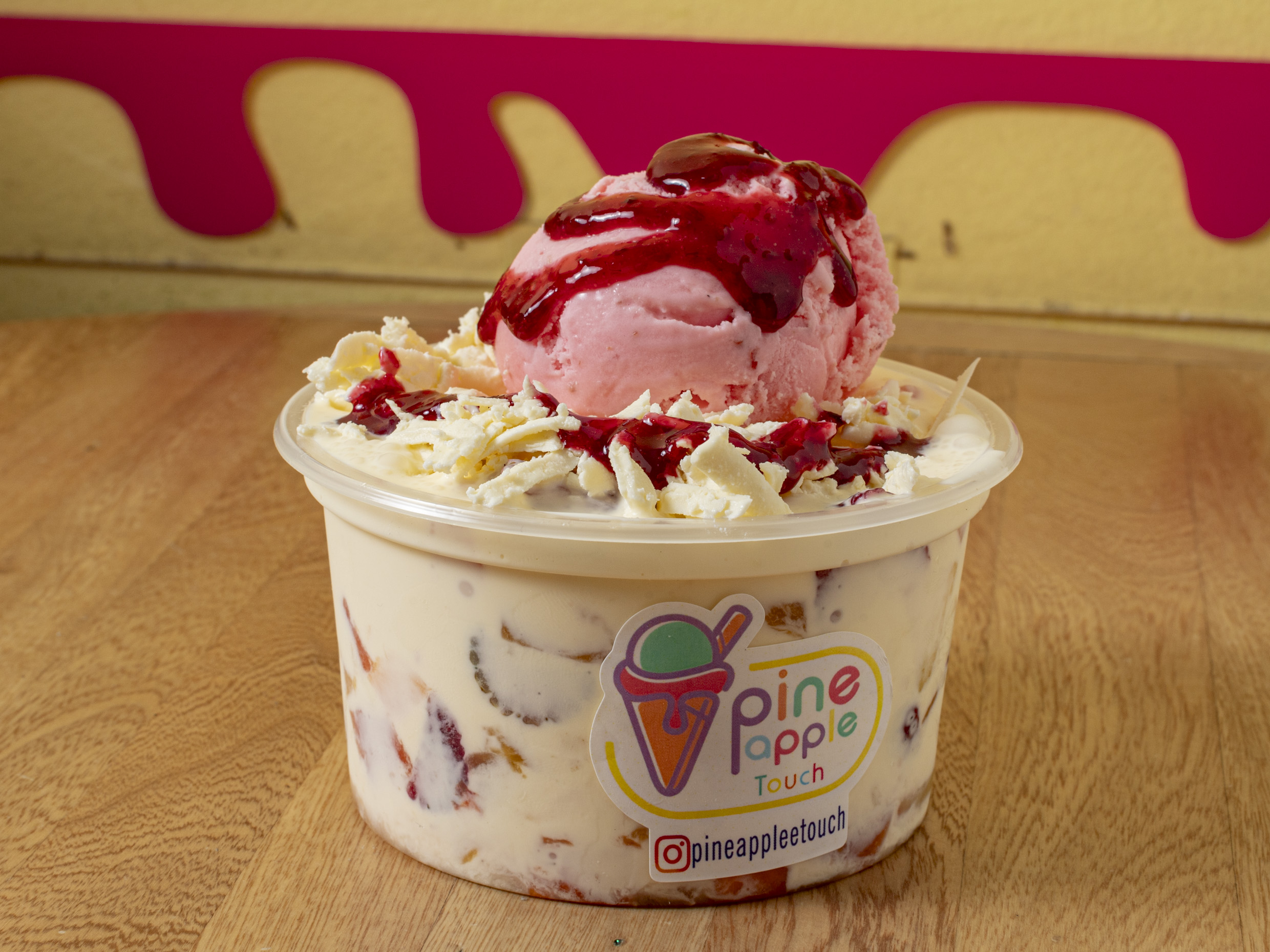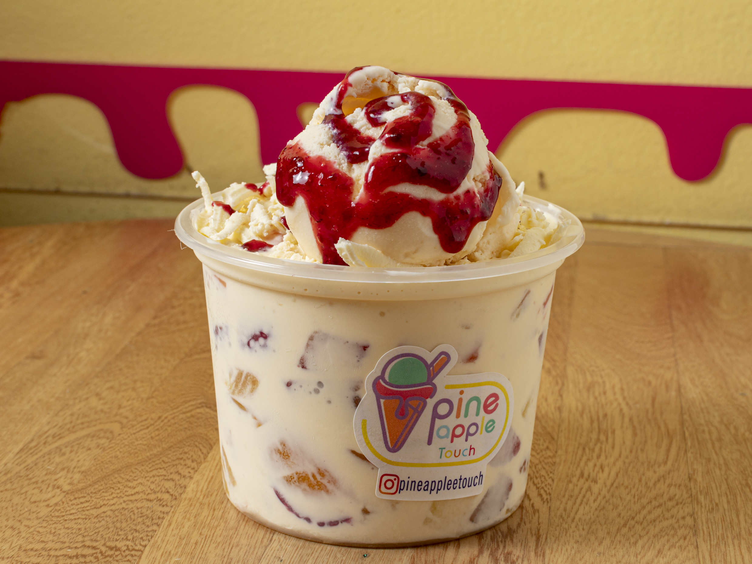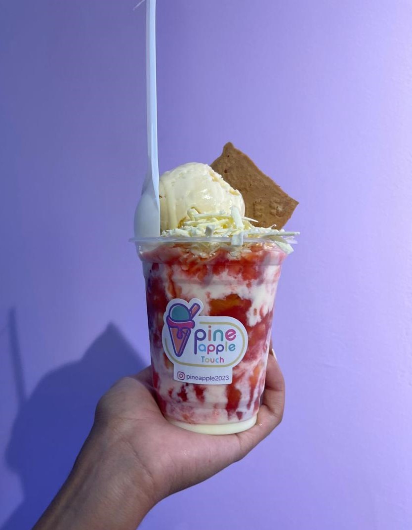 Deliciosa crema de la casa, piña, manzana, durazno, papaya, fresas, 1 bola de helado popsy y queso..