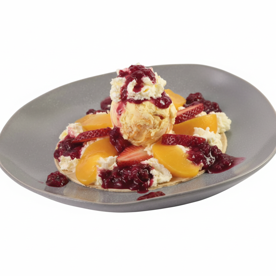 Oblea crujiente con chantilly, 1 sabor de helado, fresas, duraznos y salsa artesanal de frutos rojos.