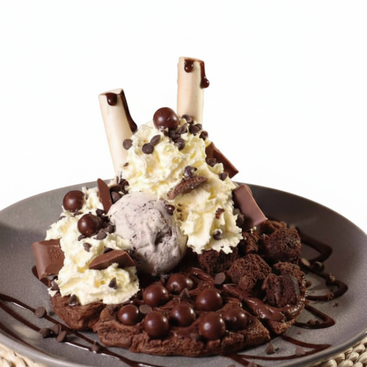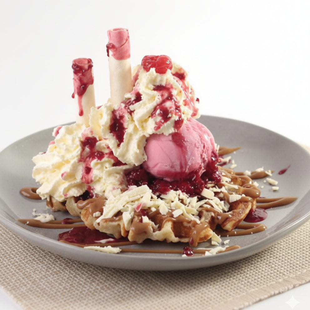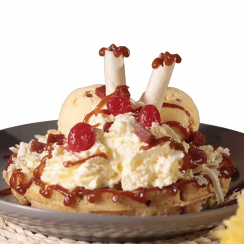 Waffle artesanal con 2 sabores de helado, chocolate Cordillera, plátano fresco, crema chantilly, cereza, barquillos y arequipe.