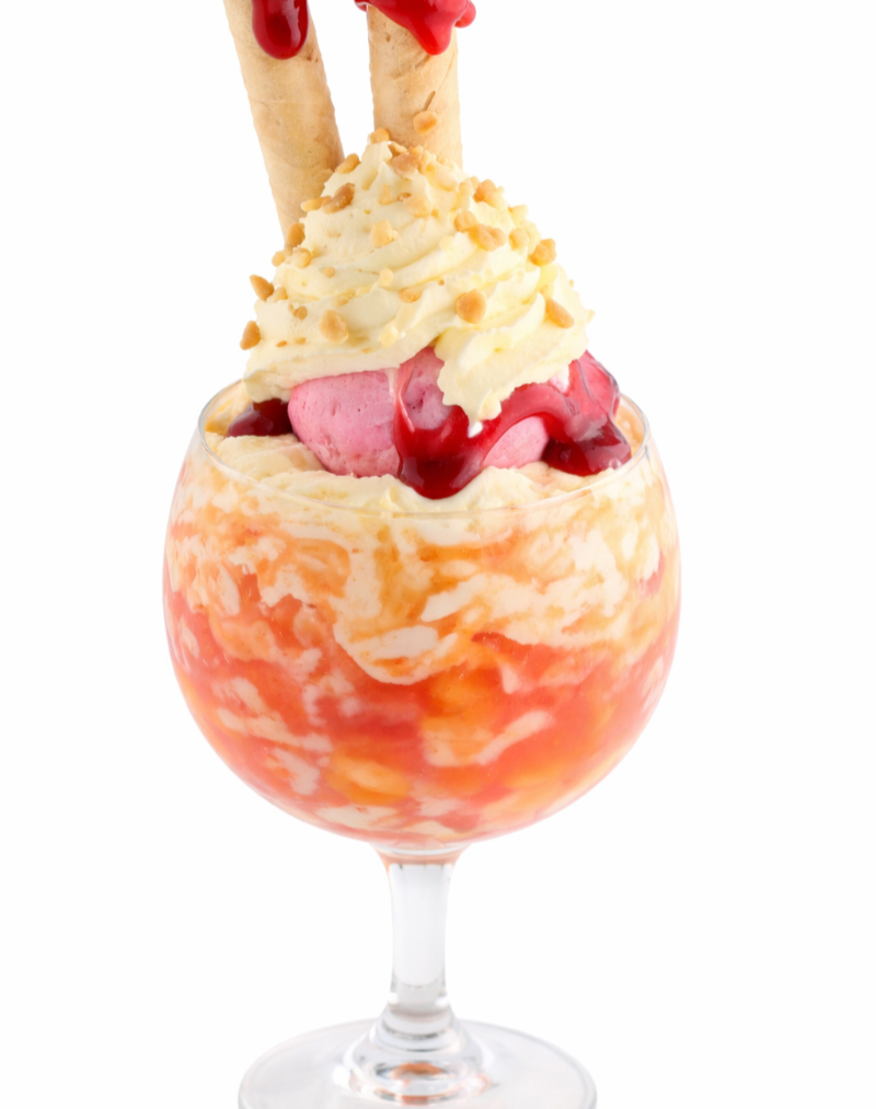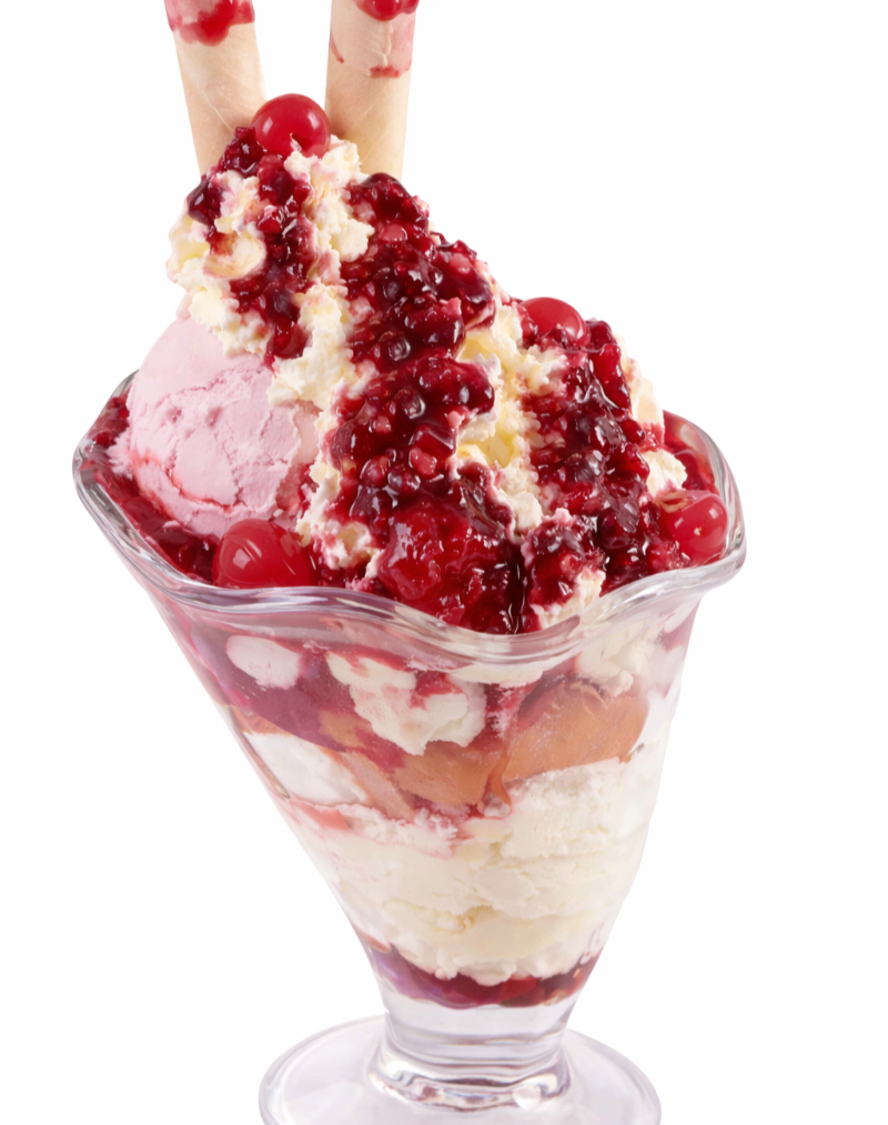 Delicioso sundae con 2 sabores de helado, salsa artesanal de frutos rojos, crema chantilly, cerezas, fresas y barquillos.