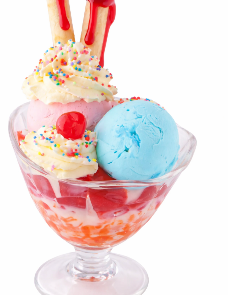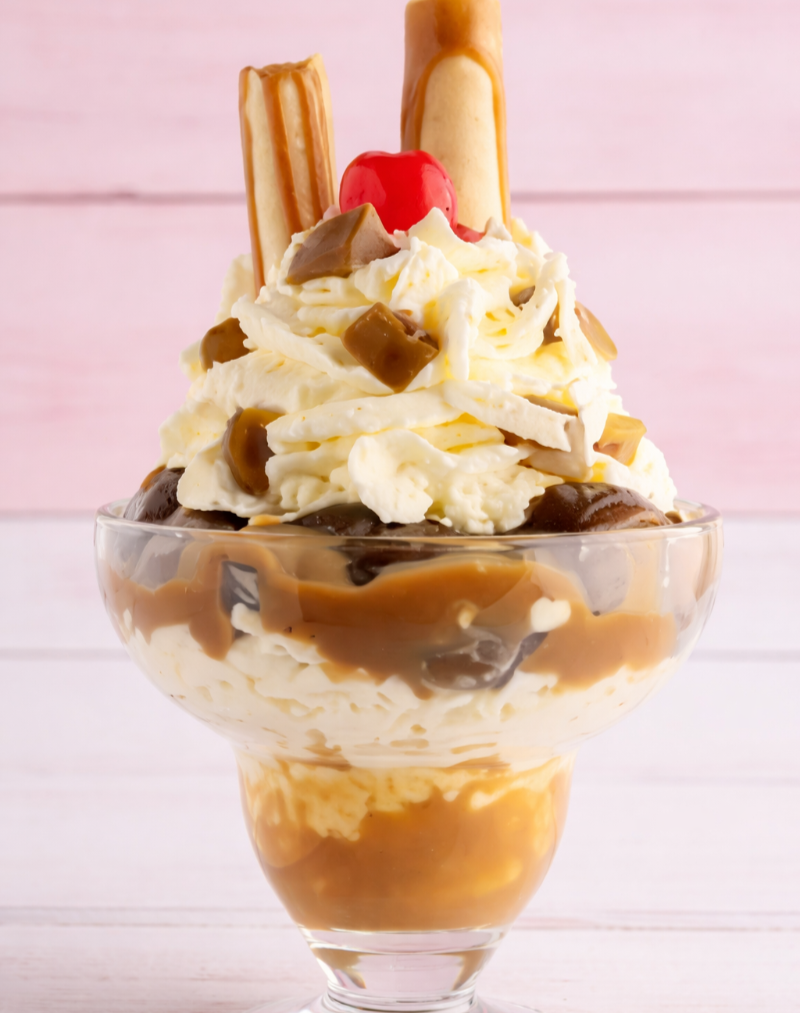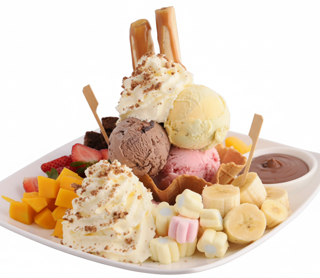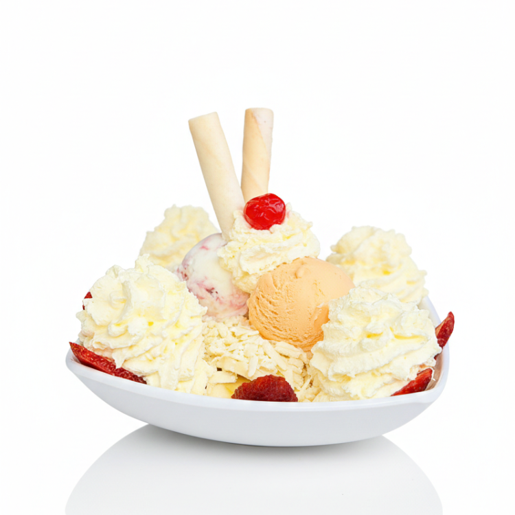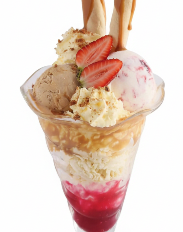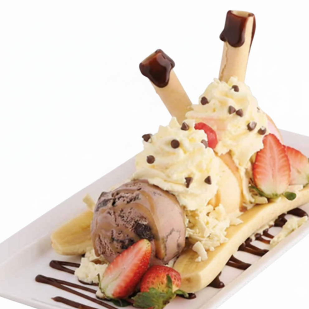Postre icónico con 3 sabores de helado a elección, crema chantilly, fresas frescas, cereza, barquillos crujientes y deliciosa salsa de arequipe. Opción: versión sencilla.