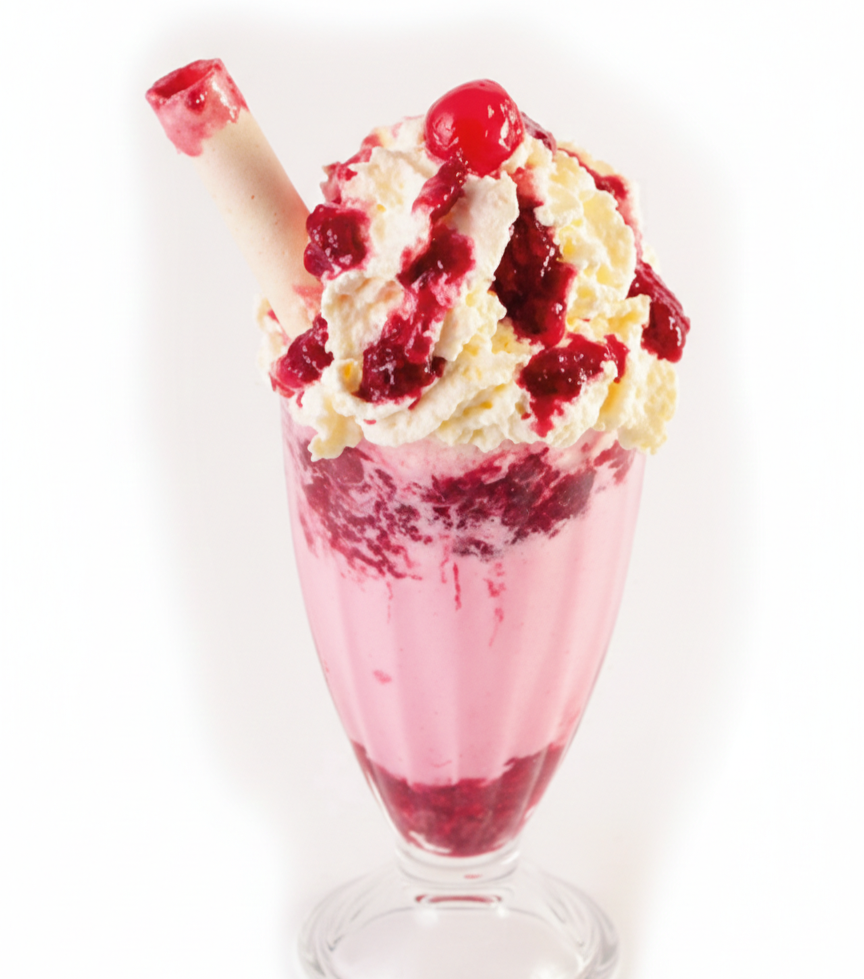 Batido cremoso con sabor de helado a elección, crema chantilly, salsa de arequipe y barquillo.