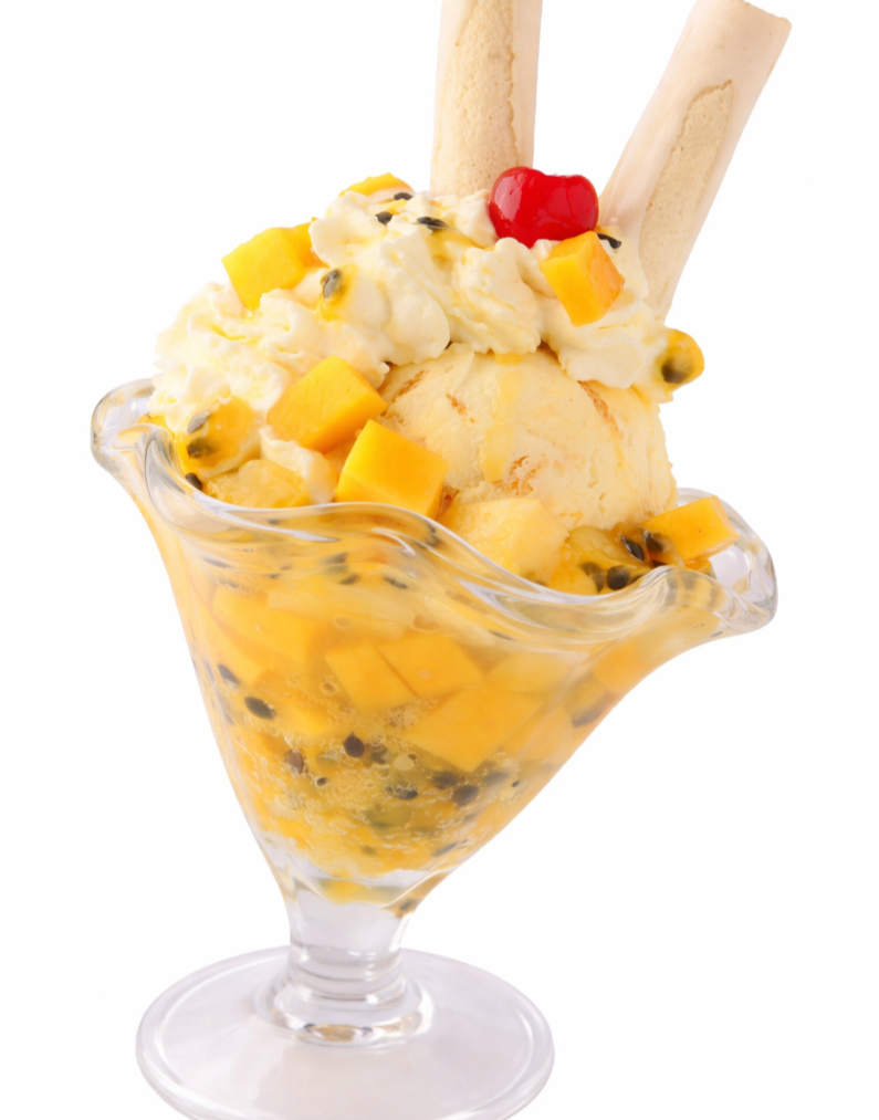 Combinación tropical de mango, piña en almíbar y confitura de maracuyá con 1 sabor de helado, crema chantilly, cerezas, barquillos y lecherita.