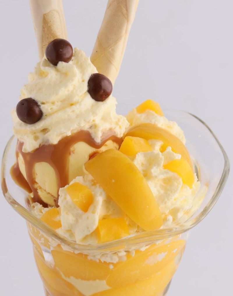 Suaves duraznos en almíbar con crema chantilly, cereza, barquillos y el toque dulce del arequipe. Versión: sin helado.