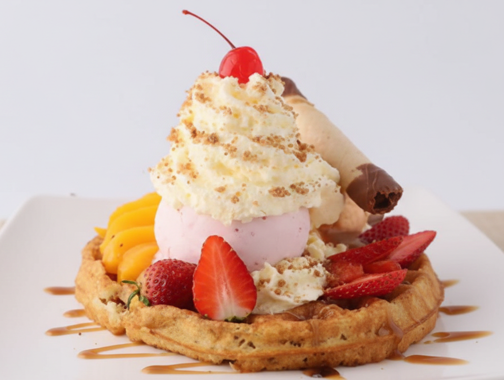 Waffle completo con 2 sabores de helado, queso, crema chantilly, fresa, durazno, cereza y arequipe.