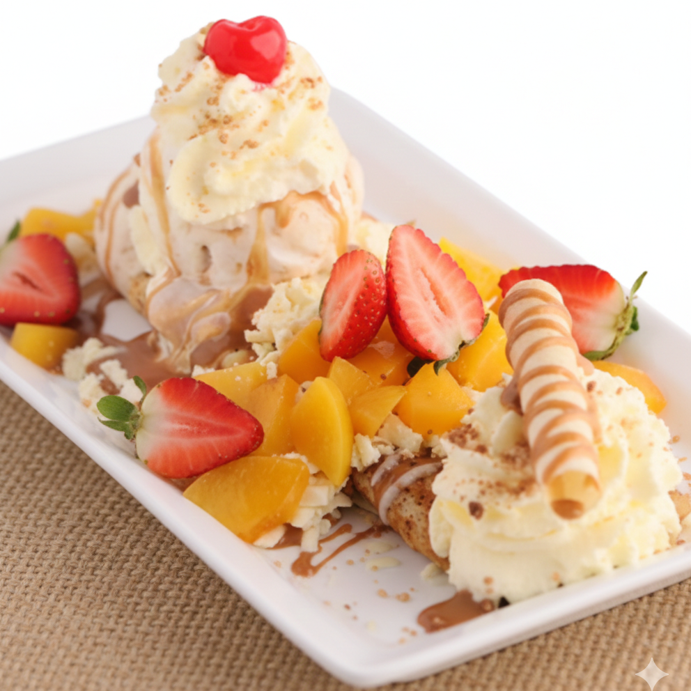 Postre icónico con 3 sabores de helado a elección, crema chantilly, fresas frescas, cereza, barquillos crujientes y deliciosa salsa de arequipe. Opción: con adición de queso.
