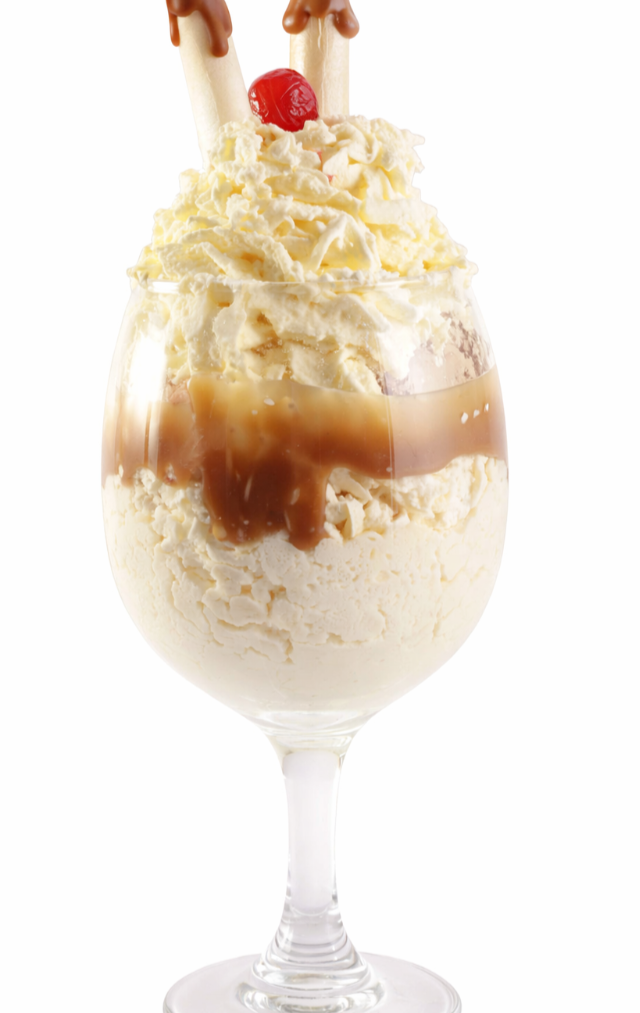 Elegante copa con 2 sabores de helado, crema chantilly, abundantes cerezas seleccionadas, barquillos y lecherita.